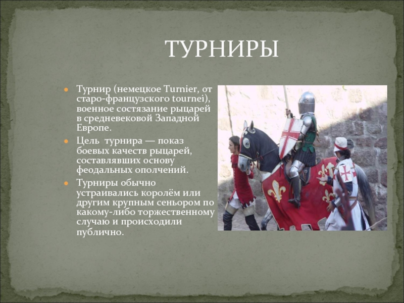 Турнир (немецкое Turnier, от старо-французского tournei), военное состязание рыцарей в средневековой