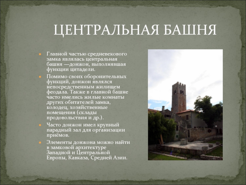 Главной частью средневекового замка являлась центральная башня —донжон, выполнявшая функции