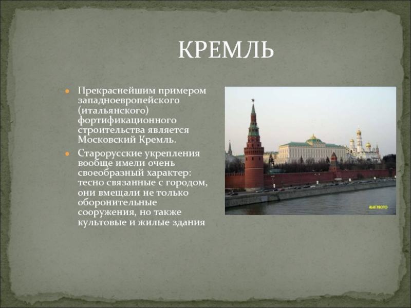Прекраснейшим примером западноевропейского (итальянского) фортификационного строительства является Московский Кремль.