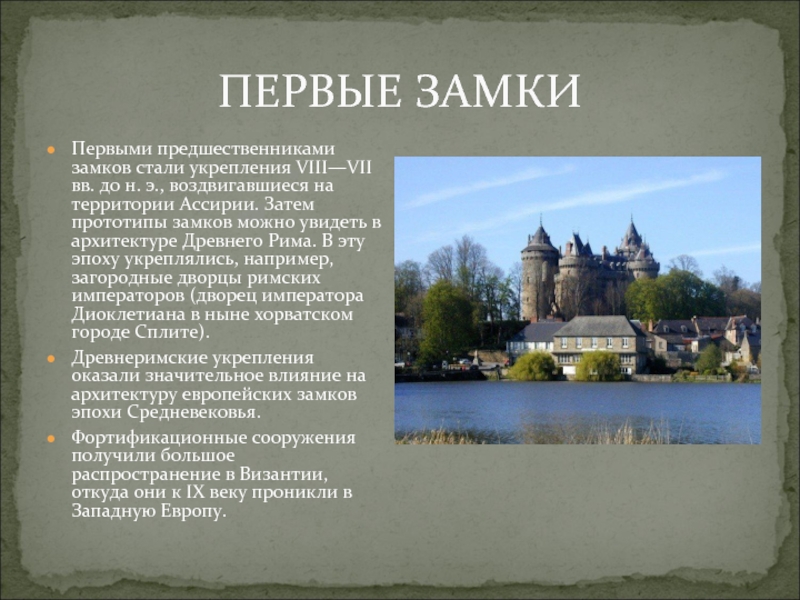 воздвигавшиеся на территории Ассирии. Затем прототипы замков можно увидеть в архитектуре Древнего Рима. В эту эпоху укреплялись, например, загородные дворцы римских императоров (дворец императора Диоклетиана в ныне хорватском городе Сплите).