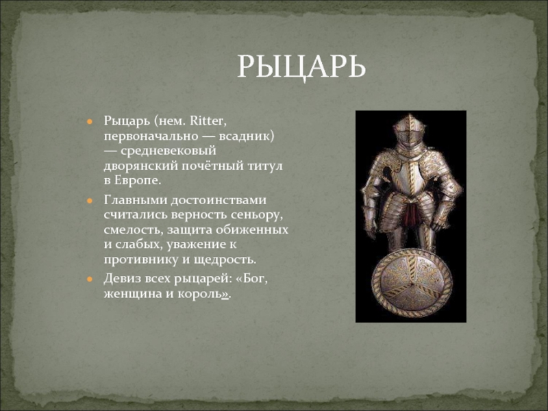 Рыцарь (нем. Ritter, первоначально — всадник) — средневековый дворянский почётный титул