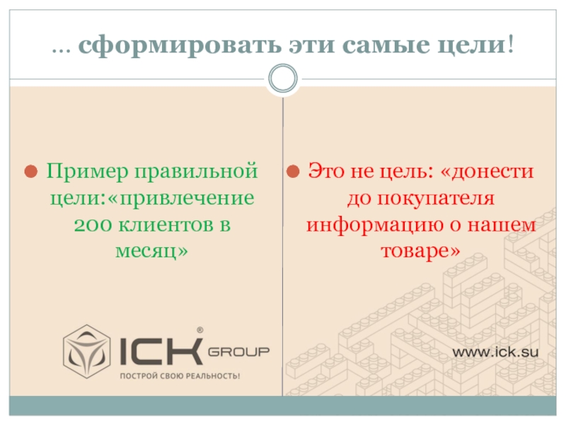 Пример правильной цели:«привлечение 200 клиентов в месяц»