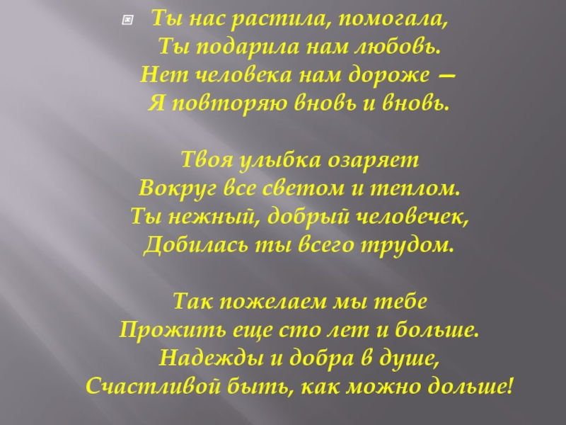 повторяю вновь и вновь. Твоя улыбка озаряет Вокруг все светом и теплом. Ты нежный, добрый человечек, Добилась ты всего трудом. Так пожелаем мы тебе Прожить еще сто лет и больше. Надежды и добра в душе, Счастливой быть, как можно дольше!