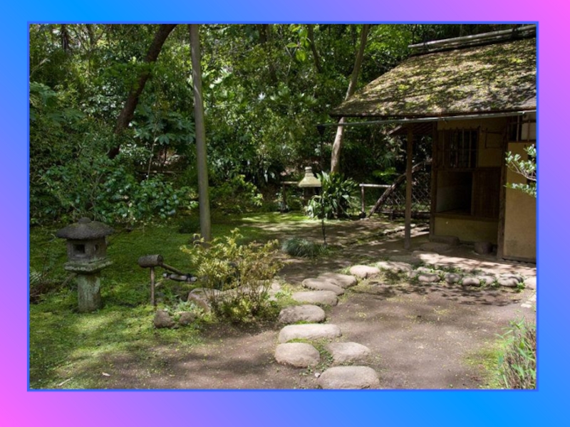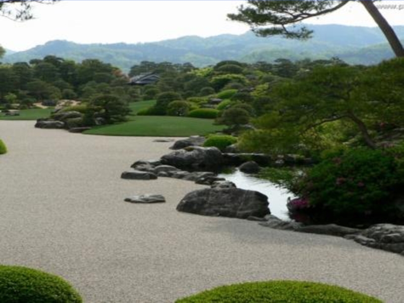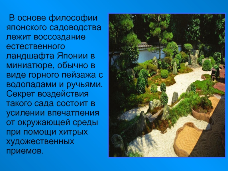 миниатюре, обычно в виде горного пейзажа с водопадами и ручьями. Секрет воздействия такого сада состоит в усилении впечатления от окружающей среды при помощи хитрых художественных приемов.