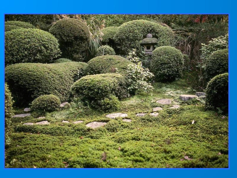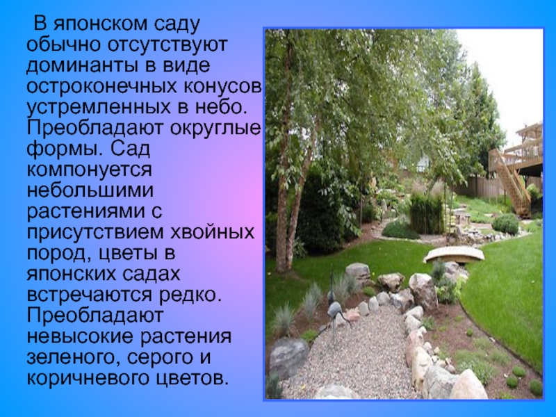 в небо. Преобладают округлые формы. Сад компонуется небольшими растениями с присутствием хвойных пород, цветы в японских садах встречаются редко. Преобладают невысокие растения зеленого, серого и коричневого цветов.