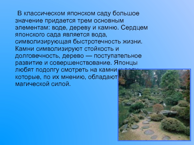 дереву и камню. Сердцем японского сада является вода, символизирующая быстротечность жизни. Камни символизируют стойкость и долговечность, дерево — поступательное развитие и совершенствование. Японцы любят подолгу смотреть на камни и воду, которые, по их мнению, обладают магической силой.