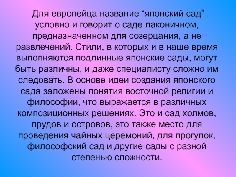 предназначенном для созерцания, а не развлечений. Стили, в которых и в наше время выполняются подлинные японские сады, могут быть различны, и даже специалисту сложно им следовать. В основе идеи создания японского сада заложены понятия восточной религии и философии, что выражается в различных композиционных решениях. Это и сад холмов, прудов и островов, это также место для проведения чайных церемоний, для прогулок, философский сад и другие сады с разной степенью сложности.