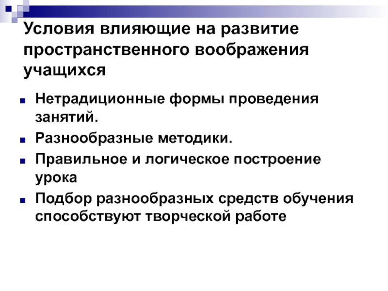 Слайд 12Условия влияющие на развитие пространственного воображения учащихся