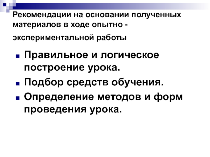 Слайд 14Рекомендации на основании полученных материалов в ходе опытно -экспериментальной работы