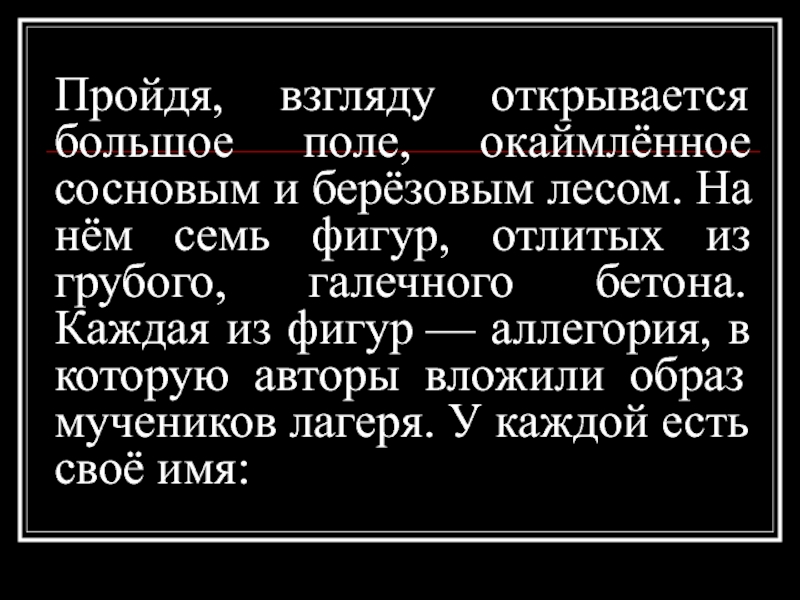 нём семь фигур, отлитых из грубого, галечного бетона. Каждая из фигур — аллегория, в которую авторы вложили образ мучеников лагеря. У каждой есть своё имя: