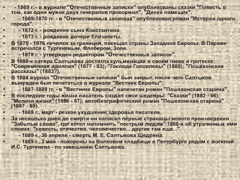 - 1869-1870 гг. - в "Отечественных записках" опубликован роман "История одного города".