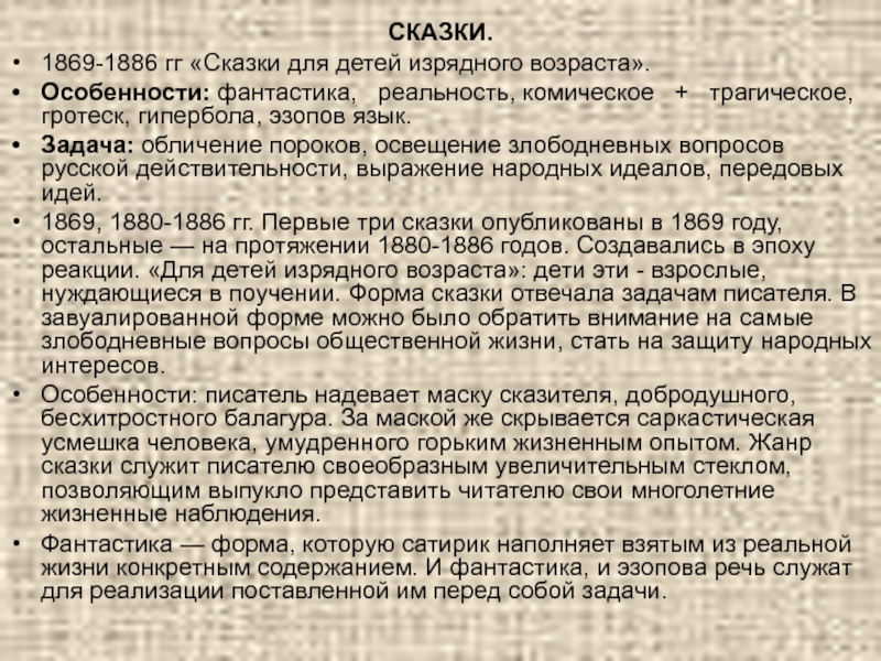 1869, 1880-1886 гг. Первые три сказки опубликованы в 1869 году, остальные — на протяжении 1880-1886 годов. Создавались в эпоху реакции. «Для детей изрядного возраста»: дети эти - взрослые, нуждающиеся в поучении. Форма сказки отвечала задачам писателя. В завуалированной форме можно было обратить внимание на самые злободневные вопросы общественной жизни, стать на защиту народных интересов.