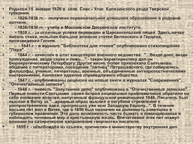 - 1844 г. - зачислен в штат канцелярии военного ведомства. "...Везде долг, везде принуждение, везде скука и ложь..." - такую характеристику дал он бюрократическому Петербургу. Другая жизнь более привлекала Салтыкова: общение с литераторами, посещение "пятниц" Петрашевского, где собирались философы, ученые, литераторы, военные, объединенные антикрепостническими настроениями, поисками идеалов справедливого общества.
