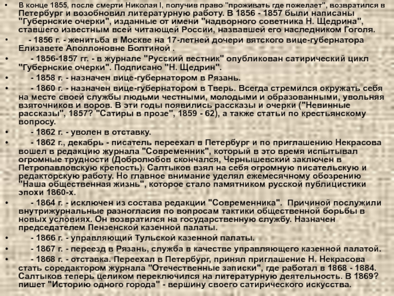 - 1860 г. - назначен вице-губернатором в Тверь. Всегда стремился окружать себя на месте своей службы людьми честными, молодыми и образованными, увольняя взяточников и воров. В эти годы появились рассказы и очерки ("Невинные рассказы", 1857? "Сатиры в прозе", 1859 - 62), а также статьи по крестьянскому вопросу.