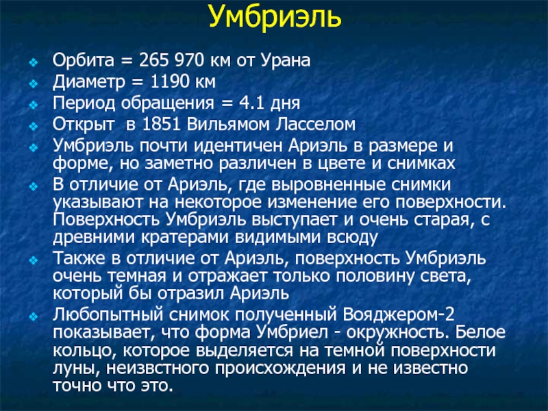 Также в отличие от Ариэль, поверхность Умбриэль очень темная и отражает только половину света, который бы отразил Ариэль