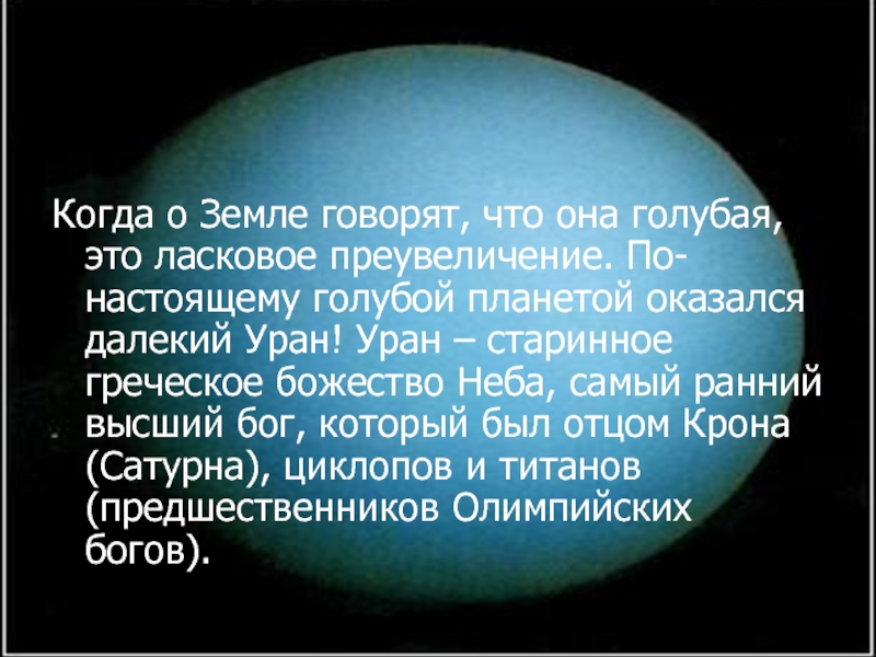 голубой планетой оказался далекий Уран! Уран – старинное греческое божество Неба, самый ранний высший бог, который был отцом Крона (Сатурна), циклопов и титанов (предшественников Олимпийских богов).