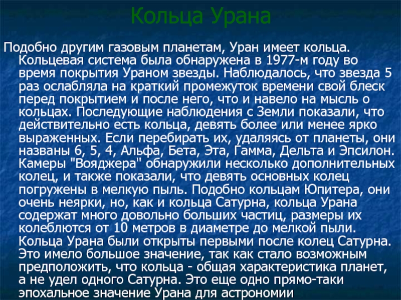 обнаружена в 1977-м году во время покрытия Ураном звезды. Наблюдалось, что звезда 5 раз ослабляла на краткий промежуток времени свой блеск перед покрытием и после него, что и навело на мысль о кольцах. Последующие наблюдения c Земли показали, что действительно есть кольца, девять более или менее ярко выраженных. Если перебирать их, удаляясь от планеты, они названы 6, 5, 4, Альфа, Бета, Эта, Гамма, Дельта и Эпсилон. Камеры "Вояджера" обнаружили несколько дополнительных колец, и также показали, что девять основных колец погружены в мелкую пыль. Подобно кольцам Юпитера, они очень неярки, но, как и кольца Сатурна, кольца Урана содержат много довольно больших частиц, размеры их колеблются от 10 метров в диаметре до мелкой пыли. Кольца Урана были открыты первыми после колец Сатурна. Это имело большое значение, так как стало возможным предположить, что кольца - общая характеристика планет, а не удел одного Сатурна. Это еще одно прямо-таки эпохальное значение Урана для астрономии