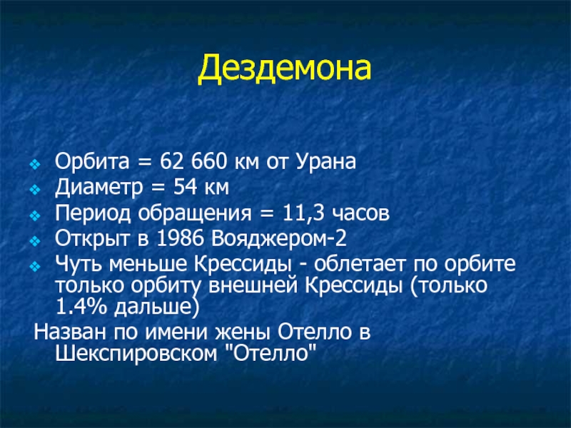 Один из самых маленьких спутников Урана, наряду с Корделией и Офелией облетает по орбите только внешние кольца Урана