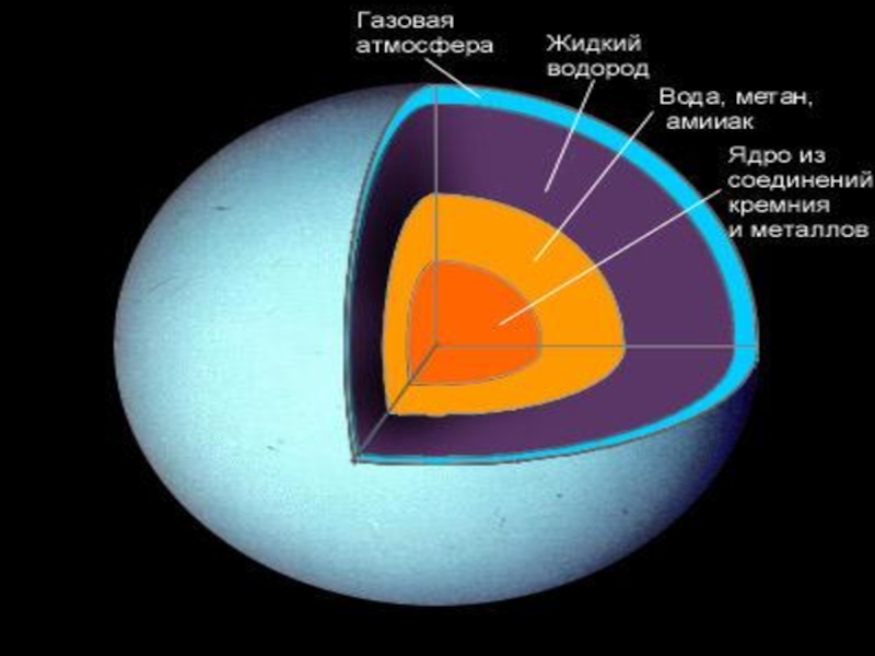 водорода составляет только приблизительно 15 % и есть небольшое количество гелия (в отличие от Юпитера и Сатурна, основным составляющим которых является водород). По-видимому, Уран не имеет каменного ядра подобно Юпитеру и Сатурну.