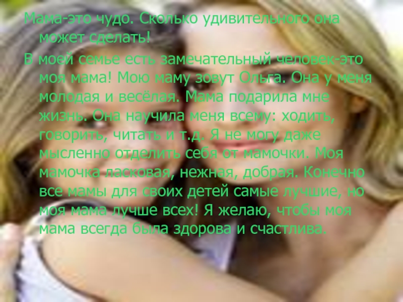 Мама- одно из первых слов, которые произносит ребёнок. Оно какбудто волшебное, только скажешь его- и вдруг появилась самая прекрасная женщина.