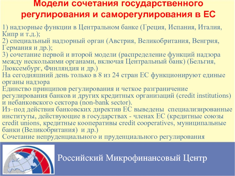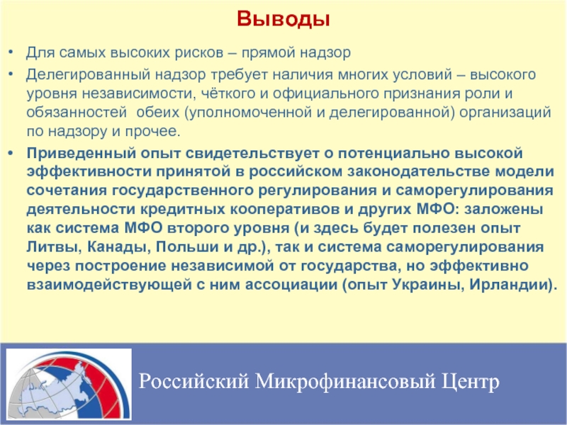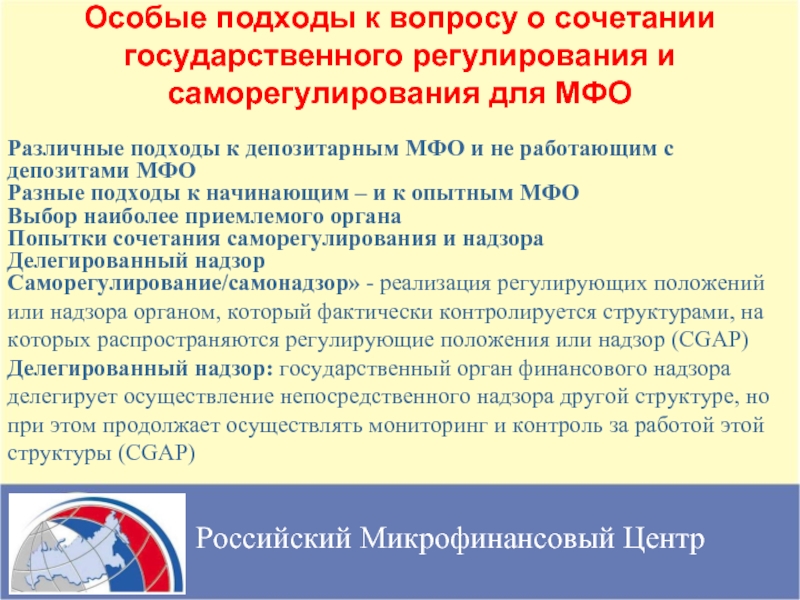 Делегированный надзор: государственный орган финансового надзора делегирует осуществление непосредственного надзора другой структуре, но при этом продолжает осуществлять мониторинг и контроль за работой этой структуры (CGAP)