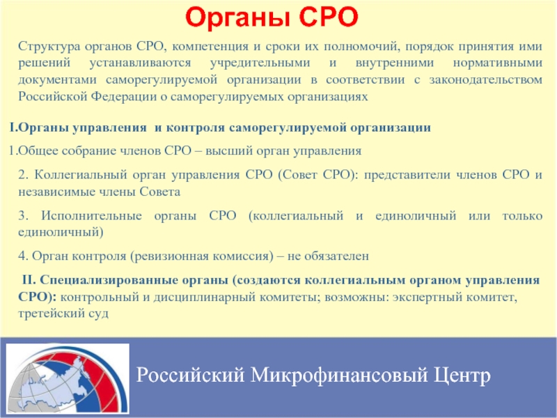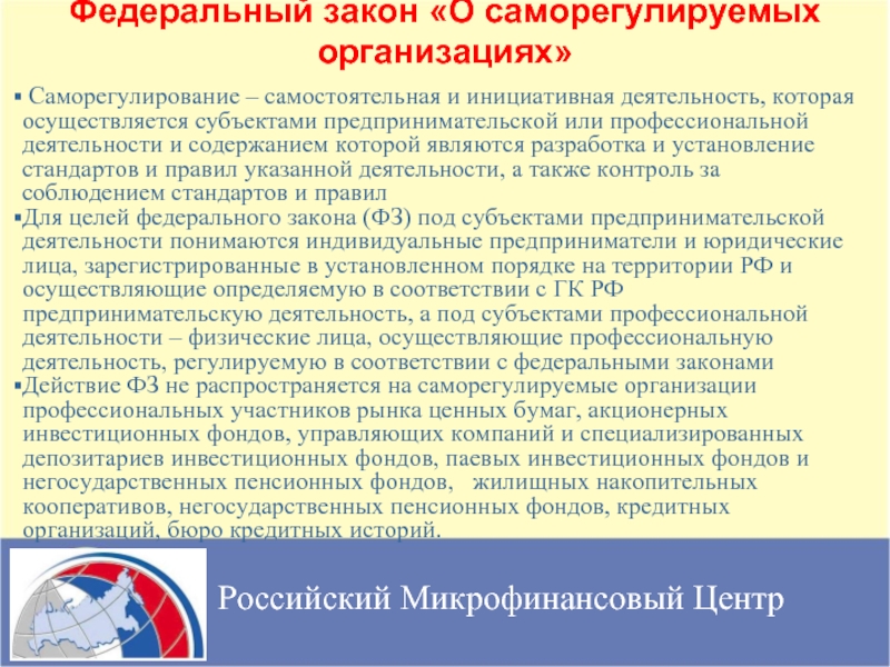 Саморегулирование/самонадзор» - реализация регулирующих положений или надзора органом, который фактически контролируется структурами, на которых распространяются регулирующие положения или надзор (CGAP)