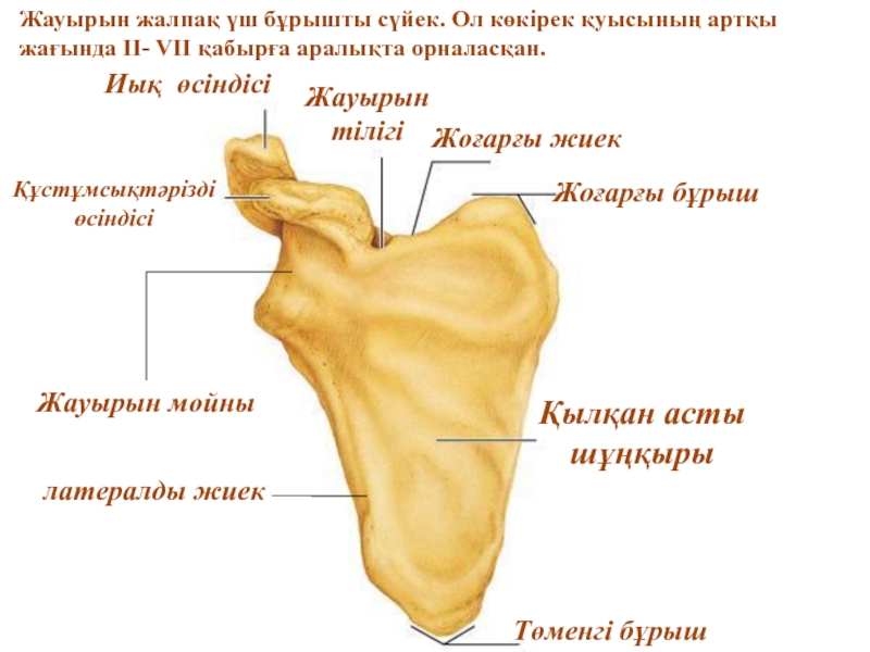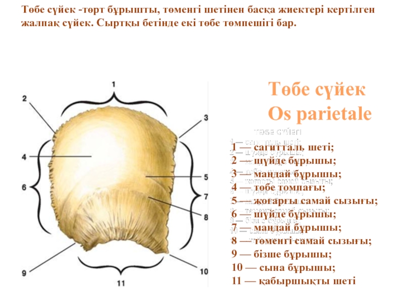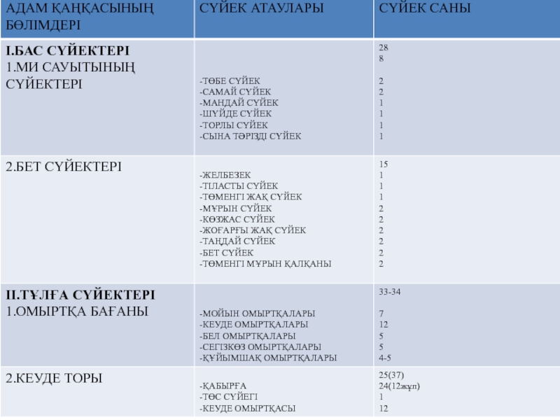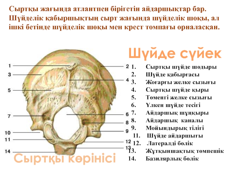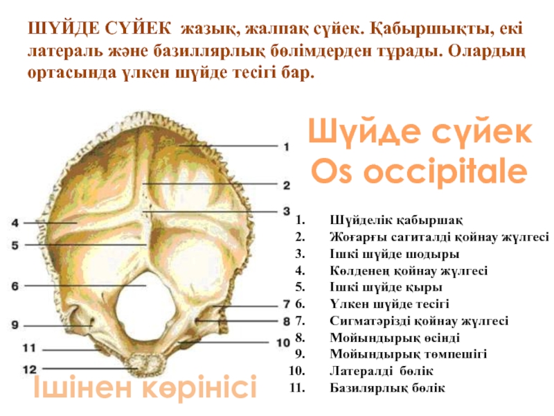 ШҮЙДЕ СҮЙЕК жазық, жалпақ сүйек. Қабыршықты, екі латераль және базиллярлық бөлімдерден тұрады. Олардың ортасында үлкен шүйде тесігі бар.