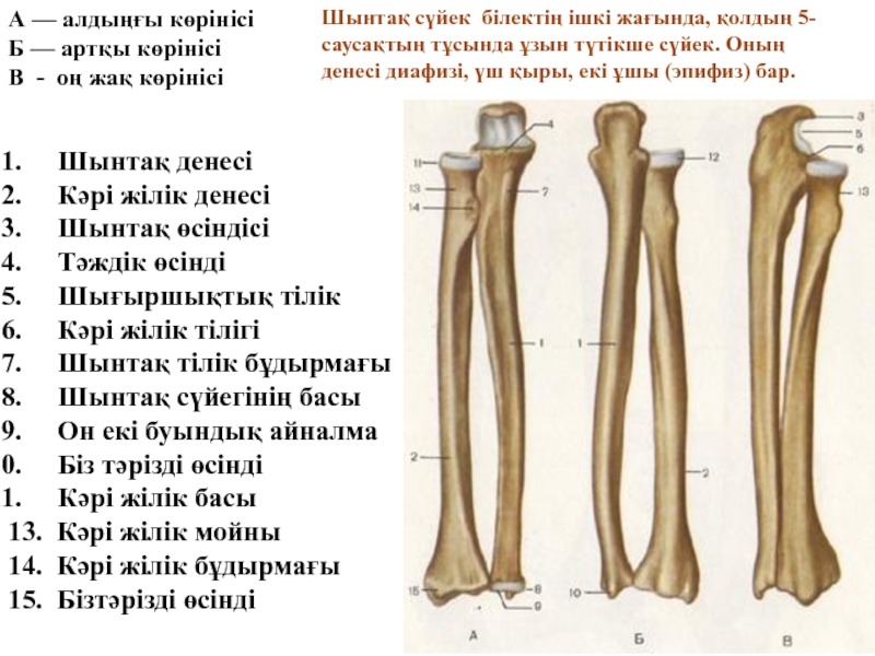 Шынтақ сүйек білектің ішкі жағында, қолдың 5-саусақтың тұсында ұзын түтікше сүйек. Оның денесі диафизі, үш қыры, екі ұшы (эпифиз) бар.