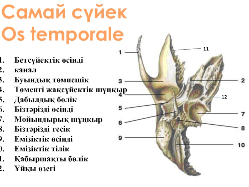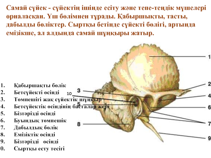 Самай сүйек - сүйектің ішінде есіту және тепе-теңдік мүшелері орналасқан. Үш бөлімнен тұрады. Қабыршықты, тасты, дабылды бөліктер. Сыртқы бетінде сүйекті бөлігі, артында емізікше, ал алдында самай шұңқыры жатыр.