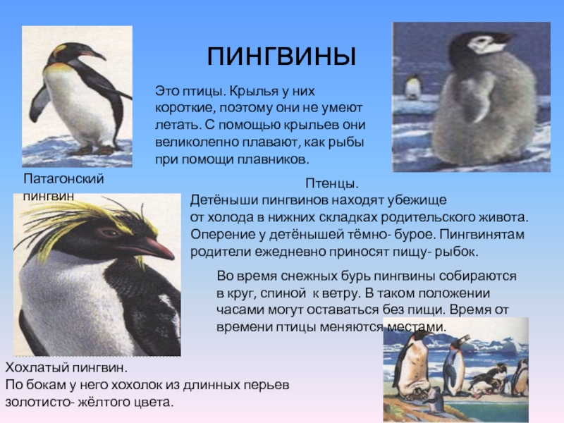 Оперение у детёнышей тёмно- бурое. Пингвинятам родители ежедневно приносят пищу- рыбок.