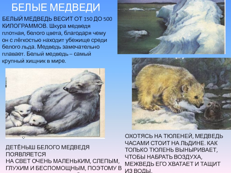ЧАСАМИ СТОИТ НА ЛЬДИНЕ. КАК ТОЛЬКО ТЮЛЕНЬ ВЫНЫРИВАЕТ, ЧТОБЫ НАБРАТЬ ВОЗДУХА, МЕЖВЕДЬ ЕГО ХВАТАЕТ И ТАЩИТ ИЗ ВОДЫ.