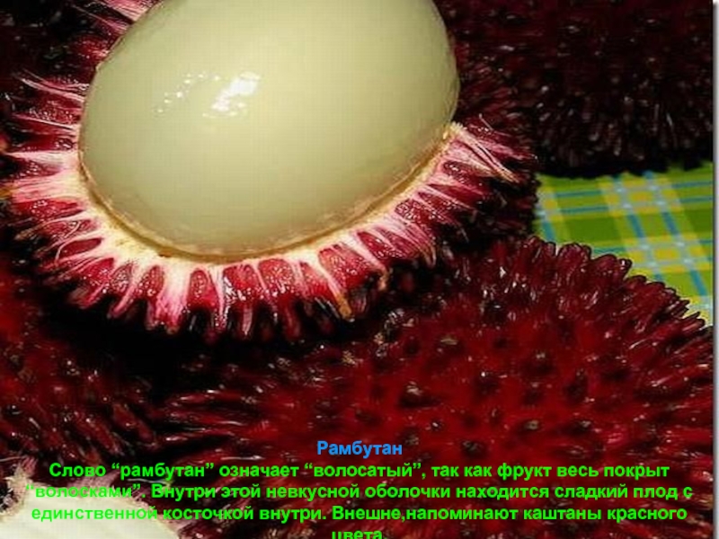 Слово “рамбутан” означает “волосатый”, так как фрукт весь покрыт “волосками”. Внутри