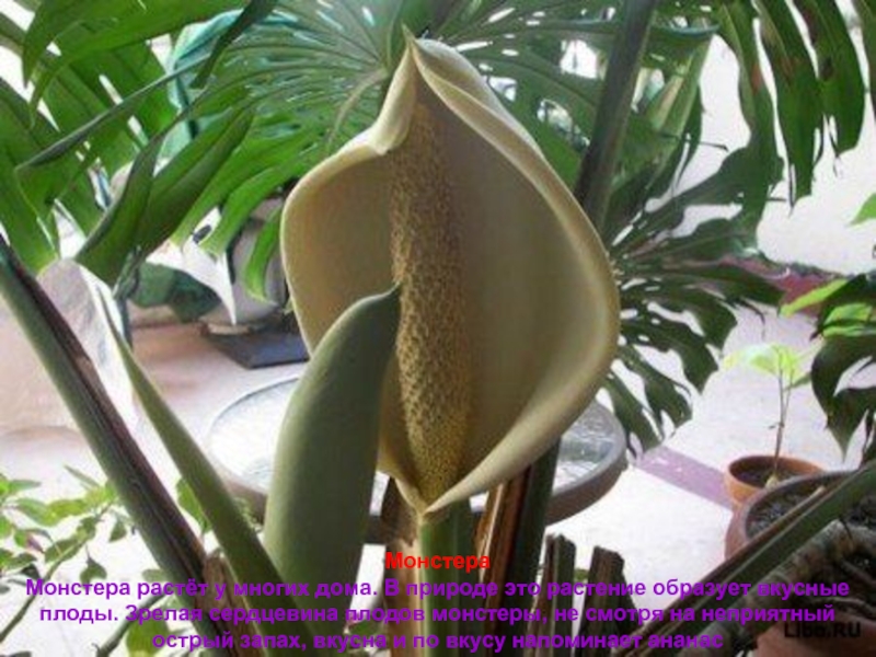 вкусные плоды. Зрелая сердцевина плодов монстеры, не смотря на неприятный острый запах, вкусна и по вкусу напоминает ананас