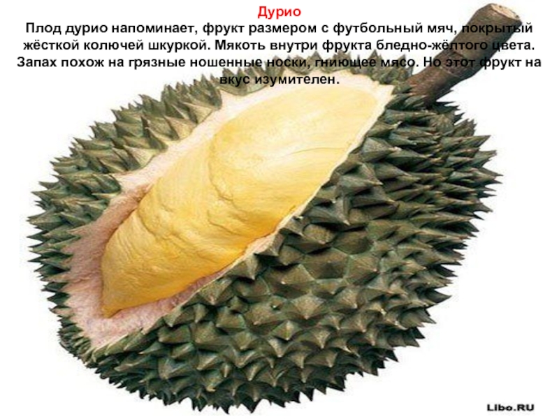 шкуркой. Мякоть внутри фрукта бледно-жёлтого цвета. Запах похож на грязные ношенные носки, гниющее мясо. Но этот фрукт на вкус изумителен.
