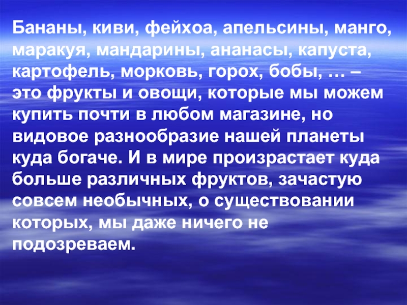 Слайд 2Бананы, киви, фейхоа, апельсины, манго, маракуя, мандарины, ананасы, капуста, картофель, морковь,