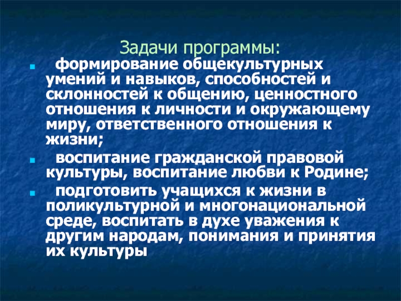 подготовить учащихся к жизни в поликультурной и многонациональной среде, воспитать в духе уважения к другим народам, понимания и принятия их культуры