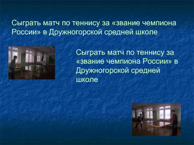 Слайд 26Сыграть матч по теннису за «звание чемпиона России» в Дружногорской средней