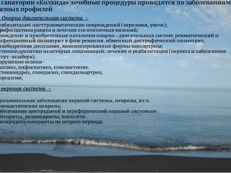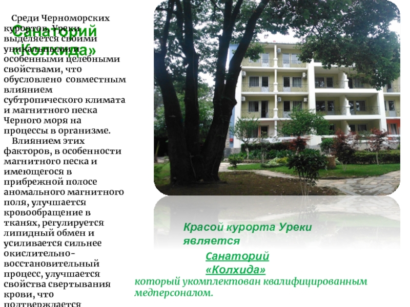 Среди Черноморских курортов, Уреки выделяется своими уникальными и особенными целебными свойствами, что обусловлено совместным влиянием субтропического климата и магнитного песка Черного моря на процессы в организме.