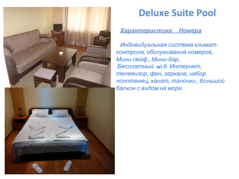 Интернет, Плазменный телевизор, фен, зеркала, набор полотенец, халат, тапочки , большой балкон с видом на море.