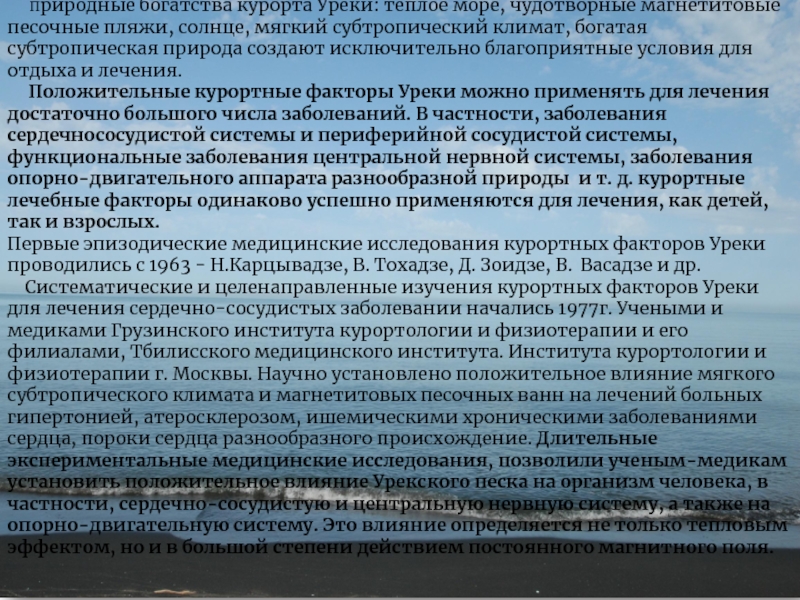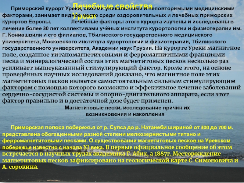 Приморский курорт Уреки, своими уникальными и неповторимыми медицинскими факторами, занимает видное место среди оздоровительных и лечебных приморских курортов Европы. Лечебные факторы этого курорта изучены и исследованы в лечение более 30 лет коллективами учёных института курортологии и физиотерапии им. Г. Кониашвили и его филиалов, Тбилисского государственного медицинского университета, Московского института курортологии и физиотерапии, Тбилисского государственного университета, Академии наук Грузии. На курорте Уреки магнитное поле, созданное титаномагнетитовыми и ферромагнитными фракциями песка и минералогический состав этих магнетитовых песков несколько раз усиливает вышеуказанный стимулирующий фактор. Кроме этого, на основе проведённых научных исследований доказано, что магнитное поле этих магнетитовых песков является самостоятельным сильным стимулирующим фактором с помощью которого возможно и эффективное лечение заболеваний сердечно-сосудистой системы и опорно-двигательного аппарата, если этот фактор правильно и в достаточной дозе будет применен.