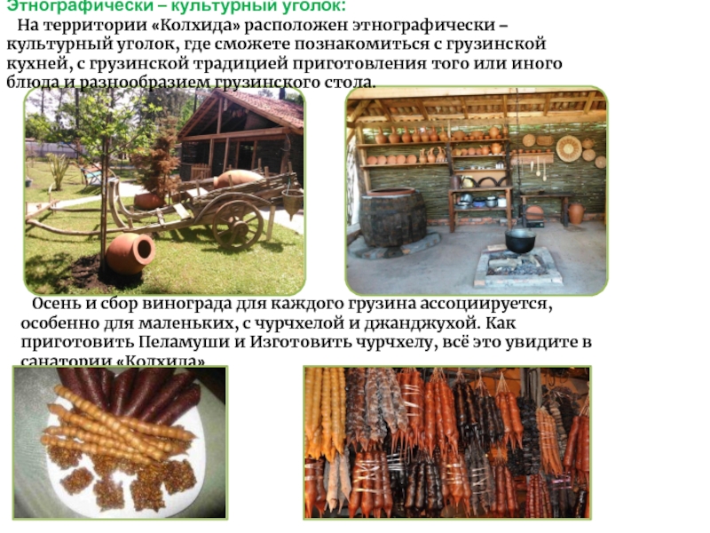 Осень и сбор винограда для каждого грузина ассоциируется, особенно для маленьких, с чурчхелой и джанджухой. Как приготовить Пеламуши и Изготовить чурчхелу, всё это увидите в санатории «Колхида»