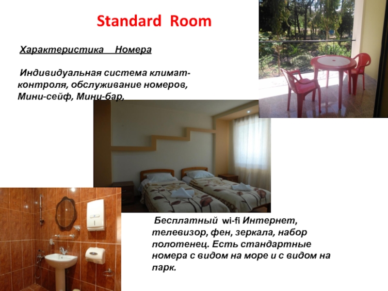 Бесплатный wi-fi Интернет, телевизор, фен, зеркала, набор полотенец. Есть стандартные номера с видом на море и с видом на парк.