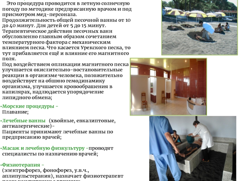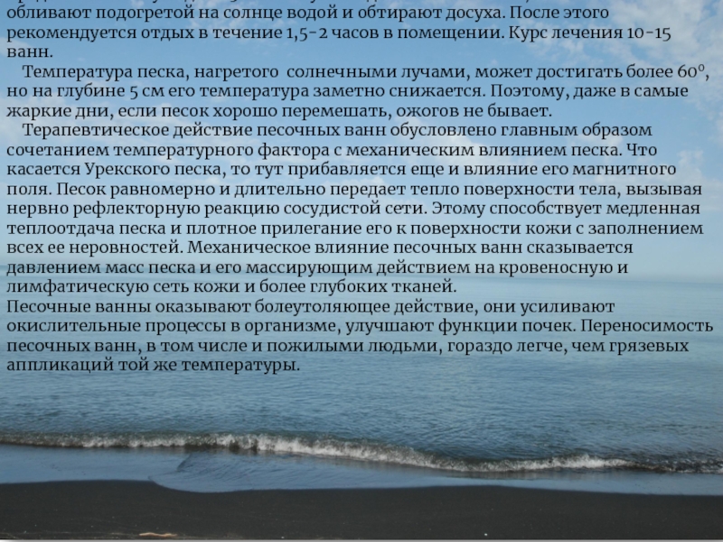 Терапевтическое действие песочных ванн обусловлено главным образом сочетанием температурного фактора с механическим влиянием песка. Что касается Урекского песка, то тут прибавляется еще и влияние его магнитного поля. Песок равномерно и длительно передает тепло поверхности тела, вызывая нервно рефлекторную реакцию сосудистой сети. Этому способствует медленная теплоотдача песка и плотное прилегание его к поверхности кожи с заполнением всех ее неровностей. Механическое влияние песочных ванн сказывается давлением масс песка и его массирующим действием на кровеносную и лимфатическую сеть кожи и более глубоких тканей.