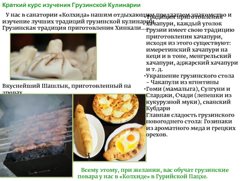 Всему этому, при желании, вас обучат грузинские повара у нас в «Колхиде» в Гурийской Пацхе.