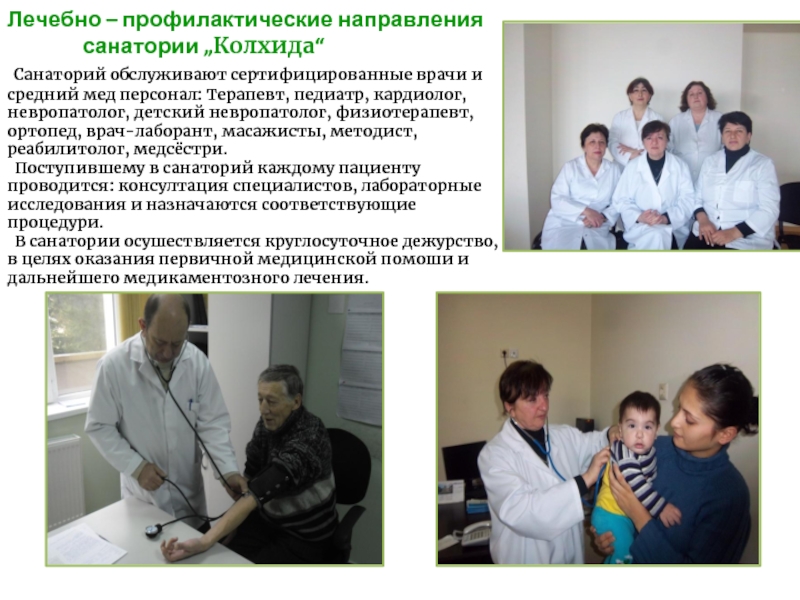 Санаторий обслуживают сертифицированные врачи и средний мед персонал: Терапевт, педиатр, кардиолог, невропатолог, детский невропатолог, физиотерапевт, ортопед, врач-лаборант, масажисты, методист, реабилитолог, медсёстри.