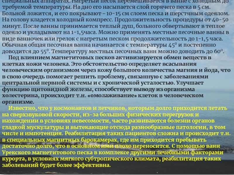 Влиянием этих факторов, в особенности магнитного песка и имеющегося в прибрежной полосе аномального магнитного поля, улучшается кровообращение в тканях, регулируется липидный обмен и усиливается сильнее окислительно-восстановительный процесс, улучшается свойства свертывания крови, что подтверждается научными исследованиями.