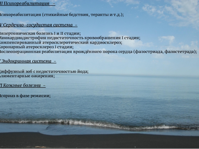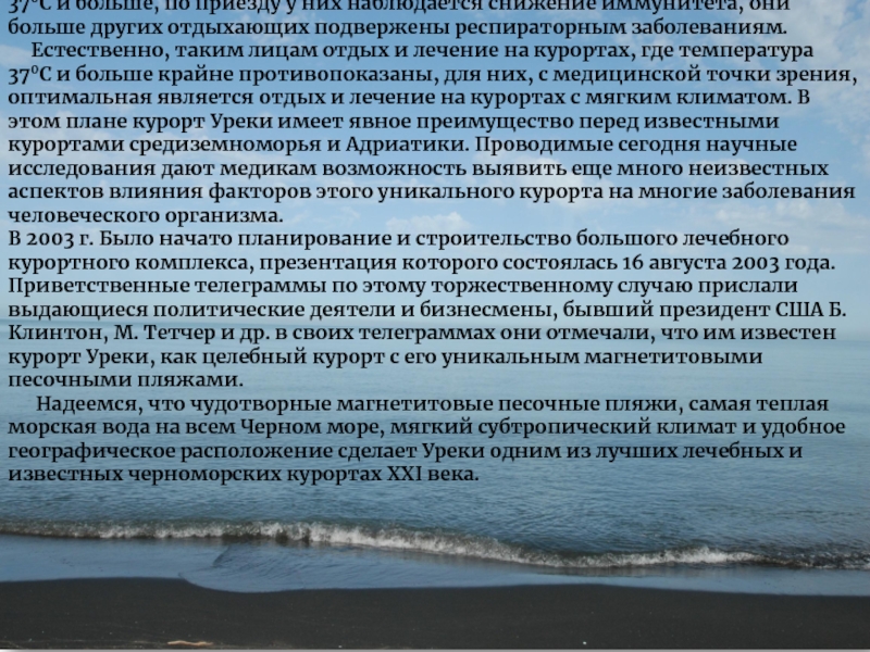 Естественно, таким лицам отдых и лечение на курортах, где температура 370С и больше крайне противопоказаны, для них, с медицинской точки зрения, оптимальная является отдых и лечение на курортах с мягким климатом. В этом плане курорт Уреки имеет явное преимущество перед известными курортами средиземноморья и Адриатики. Проводимые сегодня научные исследования дают медикам возможность выявить еще много неизвестных аспектов влияния факторов этого уникального курорта на многие заболевания человеческого организма.