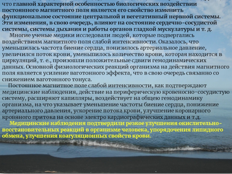 1968, Г. Блинкова, 1969, А. коган, 1971, Г.яковлева, 1973, Т. Жгенти, 1972, Г. Комарова, 1971 и другие) что главной характерной особенностью биологических воздействии постоянного магнитного поля является его свойство изменить функциональное состояние центральной и вегетативный нервной системы. Эти изменения, в свою очередь, влияют на состояние сердечно-сосудистой системы, системы дыхания и работы органов гладкой мускулатуры и т. д.