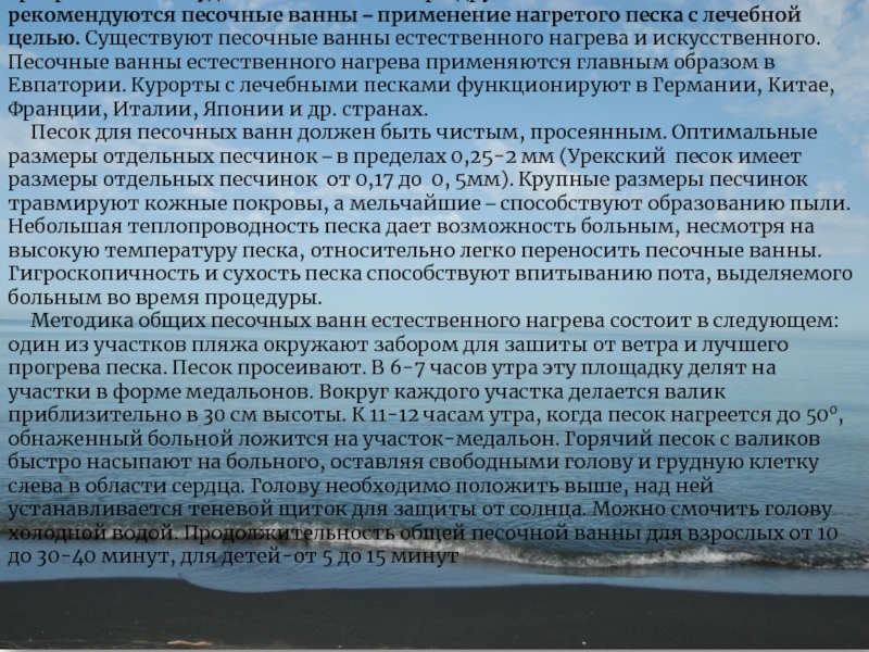 Методика общих песочных ванн естественного нагрева состоит в следующем: один из участков пляжа окружают забором для зашиты от ветра и лучшего прогрева песка. Песок просеивают. В 6-7 часов утра эту площадку делят на участки в форме медальонов. Вокруг каждого участка делается валик приблизительно в 30 см высоты. К 11-12 часам утра, когда песок нагреется до 500, обнаженный больной ложится на участок-медальон. Горячий песок с валиков быстро насыпают на больного, оставляя свободными голову и грудную клетку слева в области сердца. Голову необходимо положить выше, над ней устанавливается теневой щиток для защиты от солнца. Можно смочить голову холодной водой. Продолжительность общей песочной ванны для взрослых от 10 до 30-40 минут, для детей-от 5 до 15 минут