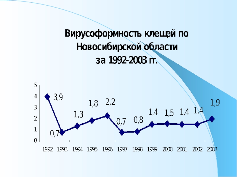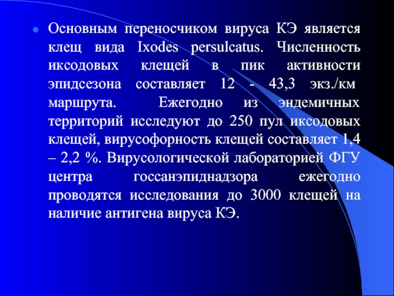 иксодовых клещей в пик активности эпидсезона составляет 12 - 43,3 экз./км маршрута. Ежегодно из эндемичных территорий исследуют до 250 пул иксодовых клещей, вирусофорность клещей составляет 1,4 – 2,2 %. Вирусологической лабораторией ФГУ центра госсанэпиднадзора ежегодно проводятся исследования до 3000 клещей на наличие антигена вируса КЭ.